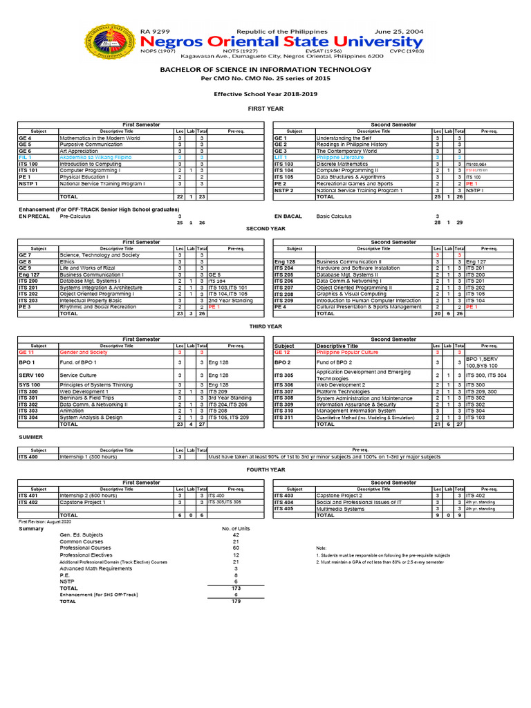 ITS 400 Internship 1 (300 hours) 3 Must have taken at least 90% of 1st to 3rd yr minor subjects and 100% on 1-3rd yr major subjects