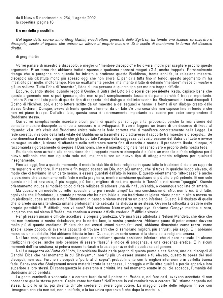 264, 1 agosto 2002 la copertina, pagina 16 Un modello possibile Nel luglio dello scorso anno Greg Martin, vicedirettore generale della Sgi-Usa, ha tenuto una lezione su maestro e discepolo, simile al legame che unisce un allievo al proprio maestro. Si è scelto di mantenere la forma del discorso diretto. di greg martin Vorrei parlare di maestro e discepolo, o meglio di “mentore-discepolo” e ho diversi motivi per scegliere proprio questo argomento. È un tema che abbiamo trattato spesso e qualcuno penserà magari «Già, anche troppo!». Personalmente ritengo che a paragone con quando ho iniziato a praticare questo Buddismo, trenta anni fa, la relazione maestrodiscepolo sia dibattuta molto più spesso oggi che non allora. E per dirla tutta fino in fondo, questo argomento mi ha infastidito per molto, molto tempo. Non so esattamente perché, ma intanto il fatto di definirlo “mentore” invece di master è già un sollievo. Tutta l’idea di “maestro”, l’idea di una persona di questo tipo per me era troppo difficile. Eppure, quando studio, quando leggo il Gosho, il Sutra del Loto o i discorsi del presidente Ikeda, capisco bene che questo argomento non si può ignorare, che non si può semplicemente lasciare da parte perché è troppo importante. L’intero Sutra del Loto parla di questo tipo di rapporto, del dialogo e dell’interazione tra Shakyamuni e i suoi discepoli. I Gosho di Nichiren, poi, o sono lettere scritte da un maestro a dei seguaci o hanno la forma di un dialogo creato dallo stesso Nichiren. Dunque, avevo di fronte questo dilemma: da un lato c’è una cosa che non capisco fino in fondo e che non mi piace troppo. Dall’altro lato, questa cosa è estremamente importante da capire per poter comprendere il Buddismo stesso. Qui vorrei semplicemente ricordare alcuni punti di quanto penso oggi a tal proposito, perché la mia visione del concetto maestro-discepolo continua a crescere e a svilupparsi. E vorrei leggere un brano di un discorso di Ikeda al riguardo: «La linfa vitale del Buddismo esiste solo nella fede corretta che si manifesta concretamente nella Legge. La fede corretta, il veicolo della linfa vitale del Buddismo si trasmette solo attraverso il rapporto tra maestro e discepolo... Se uno dimentica il maestro originale che gli ha portato l’acqua della saggezza dal vasto oceano del Sutra del Loto e invece ne segue un altro, è sicuro di affondare nella sofferenza senza fine di nascita e morte». Il presidente Ikeda, dunque, ci raccomanda rigorosamente di seguire il Daishonin, che è il maestro originale nel senso vero e proprio della nostra fede. Studiando sono arrivato alla conclusione che il rapporto maestro-discepolo è di fatto un modello di fede religiosa per il nuovo millennio che non riguarda solo noi, ma costituisce un nuovo tipo di atteggiamento religioso per qualsiasi insegnamento. Fino ad oggi, fino a questo momento, il modello stabilito di fede religiosa in quasi tutte le tradizioni è stato un rapporto tra superiore e inferiore. Il maestro è fin troppo spesso un Dio, non più umano, che si trova in qualche luogo elevato, di modo che ci troviamo, in un certo senso, a essere guardati dall’alto in basso. E questo orientamento “alto-basso” è anche la posizione che assumiamo nella fede e nella preghiera, mentre cerchiamo qualcuno di più alto o più potente. E non solo questa entità ci sovrasta, è più saggia, più forte, migliore di noi, ma questa è “lassù” e noi siamo “quaggiù”. Questo orientamento induce al modello tipico di fede religiosa di adorare una divinità, un’entità, o comunque vogliate chiamarla. Ma questo è un modello corretto, specialmente per i nostri tempi? La mia conclusione è: «No, non lo è». E di fatto, ogni volta che il fondatore, la grande persona che ha dato inizio a una tradizione religiosa, viene posto in alto o messo su un piedistallo, cosa accade a noi? Rimaniano in basso o siamo messi su un piano inferiore. Questo è il risultato di quella che io credo sia una tendenza umana profondamente radicata, la sfiducia in se stessi. Ovvero la difficoltà a credere nelle proprie possibilità. È difficile, non vi pare? Noi recitiamo Nam-myoho-renge-kyo, facciamo Gongyo mattina e sera, leggiamo che noi siamo il Budda, ma continua a essere difficile crederlo. È difficile viverlo. Per gli esseri umani è difficile accettare la propria grandezza. C’è una frase attribuita a Nelson Mandela, che dice che noi non temiamo la nostra debolezza, ma la nostra luce, la nostra grandezza. Abbiamo paura di poter essere davvero molto più di quanto crediamo. E dato che noi esseri umani siamo fatti così, abbiamo dimostrato come razza, come specie, come popolo, di avere la capacità di trovare altri che ci sembrano migliori, più altruisti, più saggi. E li abbiamo messi su un piedistallo. Noi abbiamo fiducia in loro. Questa, in un certo senso, è la storia della religione umana. Nel fare così, operiamo una autonegazione e accettiamo questa posizione inferiore, che ci pare naturale. In alcune tradizioni religiose, anche solo pensare di essere “lassù” è indice di arroganza, è una credenza eretica. E in alcuni momenti dell’era cristiana, si poteva essere torturati e bruciati per aver detto qualcosa del genere. Nei La saggezza del Sutra del Loto, il presidente Ikeda parla proprio di questo punto e cita Nehru, uno dei discepoli di Gandhi. Dice che nel momento in cui Shakyamuni non fu più un essere umano e fu elevato, questo fu opera dei suoi discepoli, non sua. Furono i discepoli a “porlo al di sopra”, probabilmente con le migliori intenzioni e in perfetta buona fede. Sapevano che Shakyamuni aveva materializzato la saggezza, il coraggio e mille altre qualità e perciò appariva loro superiore a loro stessi. Di conseguenza lo elevarono a divinità. Ma nel momento esatto in cui ciò accadde, l’umanità del Buddismo andò perduta. La gente cominciò a venerarlo e a cercare fuori da sé il potere del Budda e, 