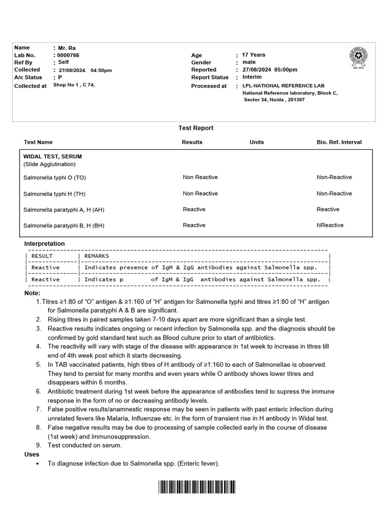 | Reactive | Indicates presence of IgM & IgG antibodies against Salmonella spp. |