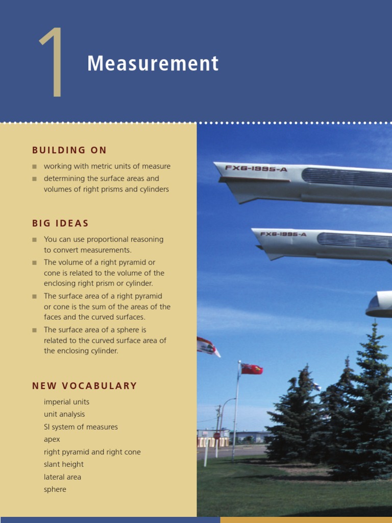 Converting within and between two systems of measurement allows you to measure lengths using the most appropriate unit from either system. The volume of a right pyramid or a right cone is 1 the volume of its enclosing right prism or right 3 cylinder. You can determine the surface area of a right pyramid by sketching a labelled diagram of its net and then calculating the area of each triangle and polygon that forms the net. For a right pyramid with a regular polygon base, the triangular faces are congruent. For a right pyramid with a regular polygon base and for a right cone, the surface area is: 1 (slant height)(perimeter of base) (base area) 2 The surface area of a sphere is equal to the curved surface area of the cylinder that encloses it.