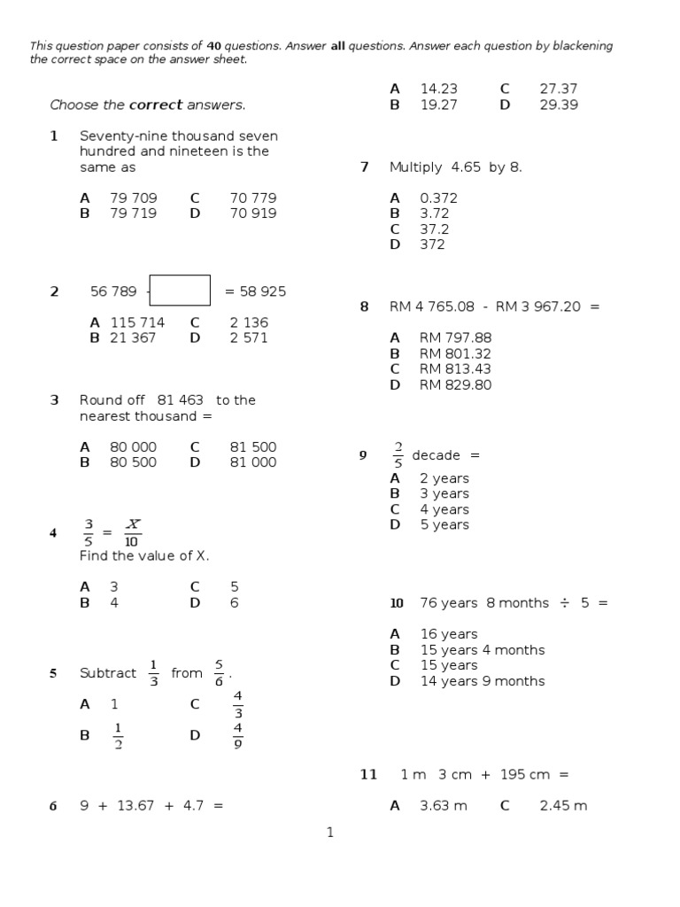 Diagram 1 What is the mass of one papaya? A kg B 4.3 kg 2.25 kg D C 3.1 17 Divide RM 7 145.80 by 5 and round off the answer to the nearest ringgit. A RM 1 429 B RM 1 432 C D RM 1 436 RM 1 440