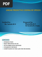 3.1. SPEECH SIGNAL The linear prediction is implemented by using 10 coefficients, on the input speech signal. We take the speech signal and multiply it by a hamming window of 200 samples (25 ms), centered on the last sample in the current frame. Then we calculate the autocorrealtion function on this window. Finding the coefficients is by the recursion of levinson durbin, that uses a toeplitz matrix. In this stage we have 10 coefficients that represent the predictor of this window. The second step is to make a 15 Hz bandwidth expansion: this will be done by the calculations as follows:
