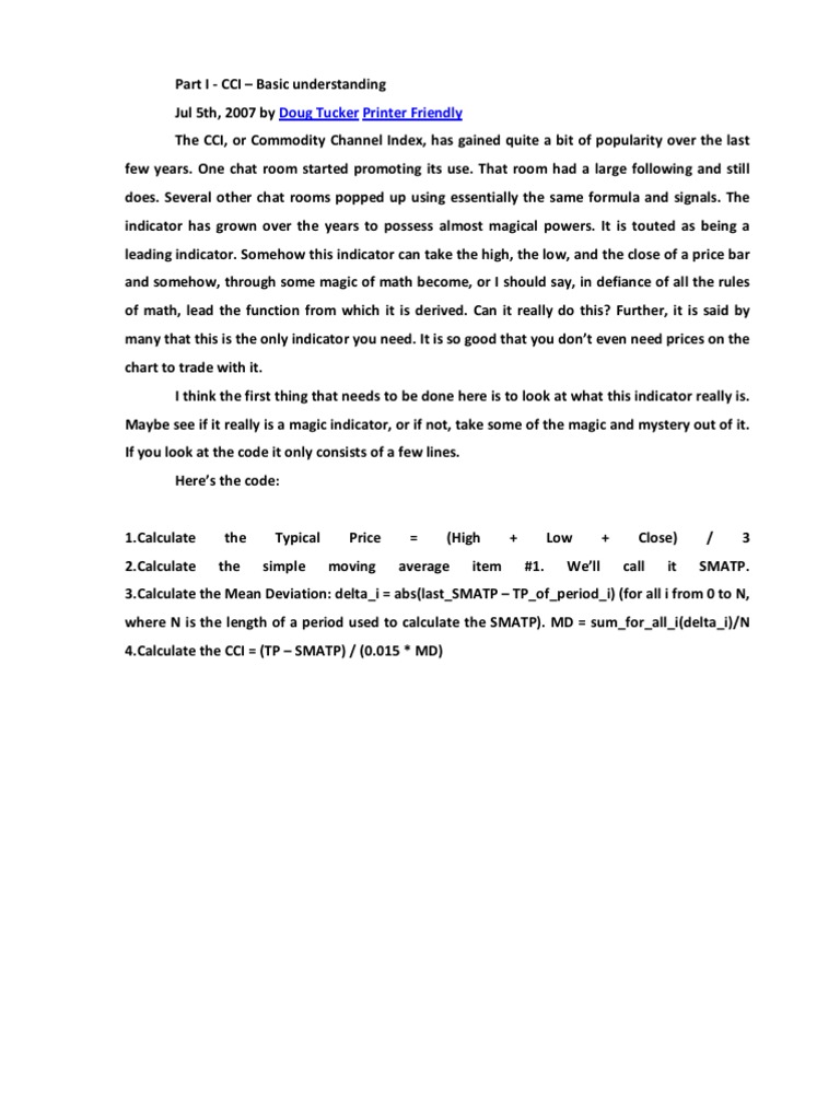 Part I - CCI Basic understanding Jul 5th, 2007 by Doug Tucker Printer Friendly The CCI, or Commodity Channel