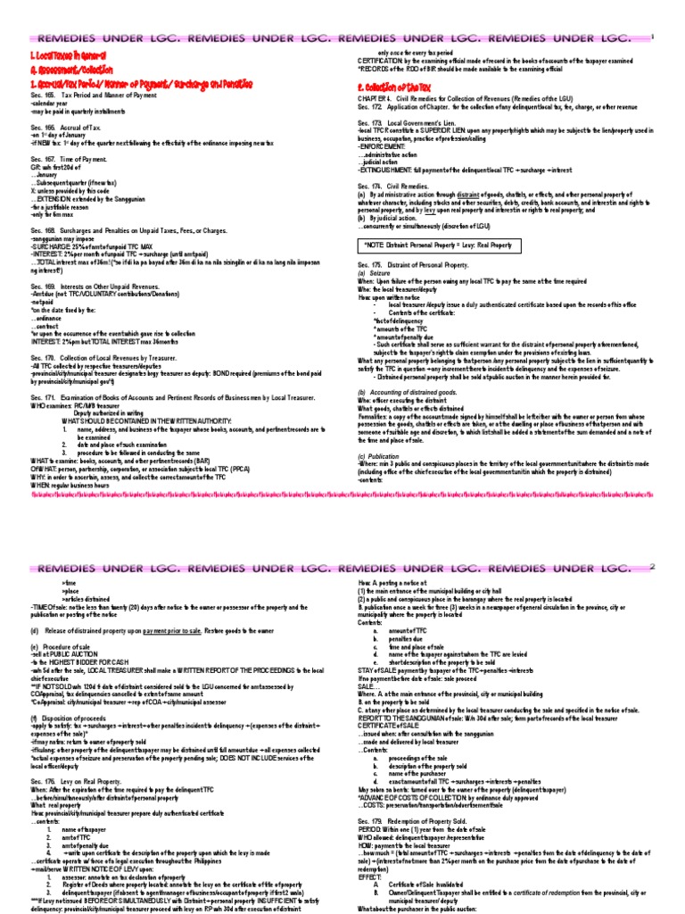 CHAPTER 4. Civil Remedies for Collection of Revenues (Remedies of the LGU) Sec. 172. Application of Chapter. for the collection of any delinquent local tax, fee, charge, or other revenue Sec. 173. Local Government's Lien. -local TFCR constitute a SUPERIOR LIEN: upon any property/rights which may be subject to the lien/property used in business, occupation, practice of profession/calling -ENFORCEMENT: .administrative action judicial action -EXTINGUISHMENT: full payment of the delinquent local TFC + surcharge + interest Sec. 174. Civil Remedies. (a) By administrative action through distraint of goods, chattels, or effects, and other personal property of whatever character, including stocks and other securities, debts, credits, bank accounts, and interest in and rights to personal property, and by levy upon real property and interest in or rights to real property; and (b) By judicial action. concurrently or simultaneously (discretion of LGU) *NOTE: Distraint: Personal Property = Levy: Real Property Sec. 175. Distraint of Personal Property. (a) Seizure When: Upon failure of the person owing any local TFC to pay the same at the time required Who: the local treasurer/deputy How: upon written notice local treasurer /deputy issue a duly authenticated certificate based upon the records of his office Contents of the certificate: *fact of delinquency * amounts of the TFC * amount of penalty due - Such certificate shall serve as sufficient warrant for the distraint of personal property aforementioned, subject to the taxpayer's right to claim exemption under the provisions of existing laws. What: any personal property belonging to that person /any personal property subject to the lien in sufficient quantity to satisfy the TFC in question + any increment thereto incident to delinquency and the expenses of seizure. - Distrained personal property shall be sold at public auction in the manner herein provided for. (b) Accounting of distrained goods. Who: officer executing the distraint What: goods, chattels or effects distrained Formalities: a copy of the account made signed by himself shall be left either with the owner or person from whose possession the goods, chattels or effects are taken, or at the dwelling or place of business of that person and with someone of suitable age and discretion, to which list shall be added a statement of the sum demanded and a note of the time and place of sale. (c) Publication -Where: min 3 public and conspicuous places in the territory of the local government unit where the distraint is made (including office of the chief executive of the local government unit in which the property is distrained) -contents: