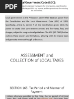 WHEN aggrieved party may file with court of competent jurisdiction: a. w/n 30d after receipt of SOJ deci b. after 60d from appeal w/SOJ, SOJ did not act on appeal Sec. 188. Publication of Tax Ordinances and Revenue Measures. WHEN: Within (10) days after their approval HOW: certified true copies of all provincial, city, and municipal tax ordinances or revenue measures shall be published in full for 3 consecutive days in a newspaper of local circulation (in lieu thereof: post at 2 conspicuous + publicly accessible places) Sec. 189. Furnishing of Copies of Tax Ordinances and Revenue Measures. Bigay copy to local treasurers for public dissemination. Sec. 190. Attempt to Enforce Void or Suspended Tax Ordinances and Revenue Measures. -after DUE NOTICE of DISAPPROVAL/SUSPENSION of the ordinance/revenue measure -sufficient ground for administrative disciplinary action against the local officials and employees responsible therefor. Sec. 191. Authority of Local Government Units to Adjust Rates of Tax Ordinances. -once every 5 years -shall not exceed 10% of rates under LGC Sec. 192. Authority to Grant Tax Exemption Privileges. -through ordinances duly approved -what can LGU grant: a. tax exemptions b. incentives c. reliefs proviso: under such terms and conditions as they may deem necessary. *power of LGUs to tax limited in 186 so power to grant exemption and privileges also subject to these limitations Sec. 193. Withdrawal of Tax Exemption Privileges. GR: tax exemptions/incentives granted to/presently enjoyed WITHDRAWN upon effectivity of the LGC X: a. local water districts b. cooperatives duly registered under RA 6938 c. non-stock and non-profit hospitals and educational institutions