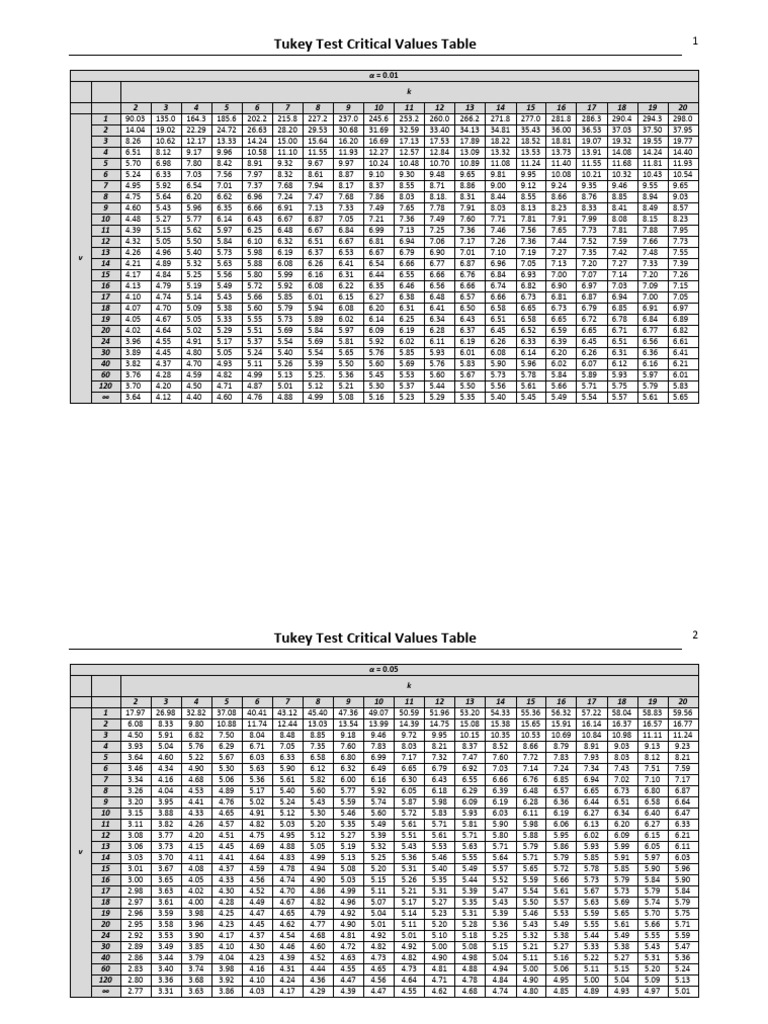 Tukey Test Critical Values Table