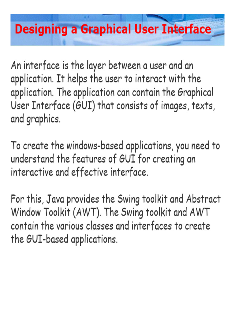 Window Toolkit (AWT). The Swing toolkit and AWT