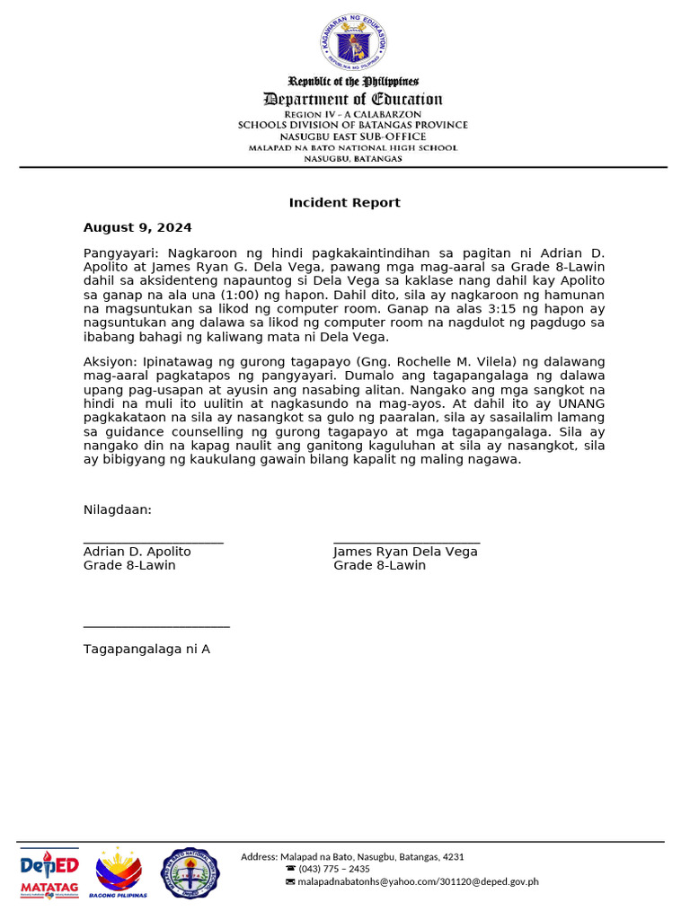 Aksiyon: Ipinatawag ng gurong tagapayo (Gng. Rochelle M. Vilela) ng dalawang