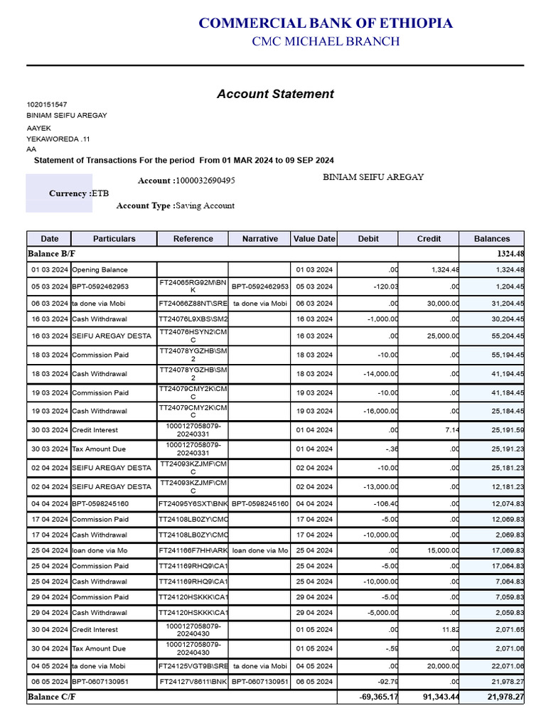 Account :1000032690495 BINIAM SEIFU AREGAY