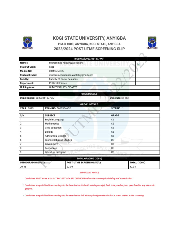 2023/2024 POST UTME SCREENING SLIP