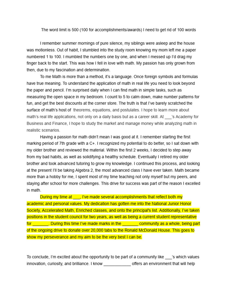 The word limit is 500 (100 for accomplishments/awards) I need to get rid of 100 words