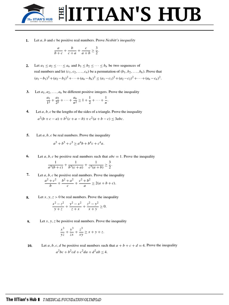 1. Let a, b and c be positive real numbers. Prove Nesbitt’s inequality