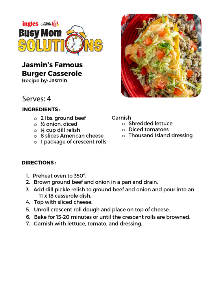 Thousand Island dressing1.Preheat oven to 350º. 2.Brown ground beef and onion in a pan and drain.3.Add dill pickle relish to ground beef and onion and pour into an 11 x 18 casserole dish.4. Top with sliced cheese.5. Unroll crescent roll dough and place on top of cheese.6. Bake for 15-20 minutes or until the crescent rolls are browned.7. Garnish with lettuce, tomato, and dressing.