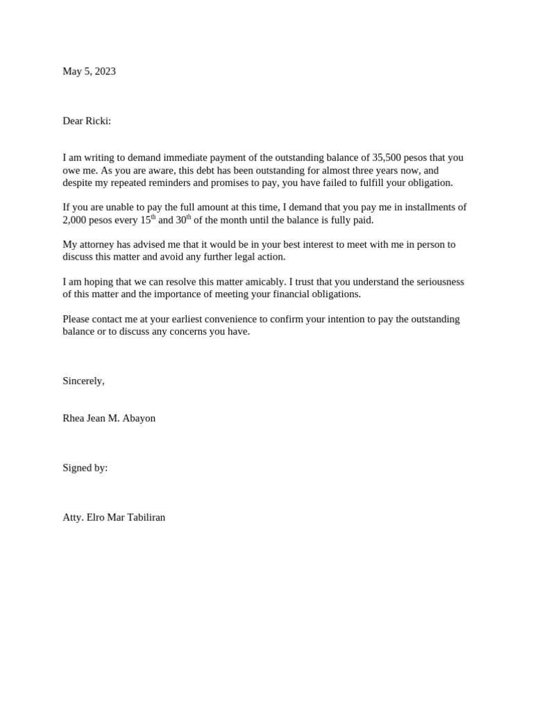 I am writing to demand immediate payment of the outstanding balance of 35,500 pesos that you