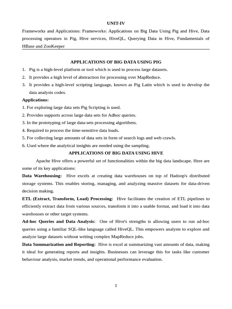 processing operators in Pig, Hive services, HiveQL, Querying Data in Hive, Fundamentals of