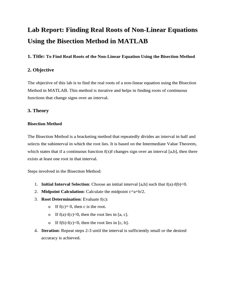 The objective of this lab is to find the real roots of a non-linear equation using the Bisection