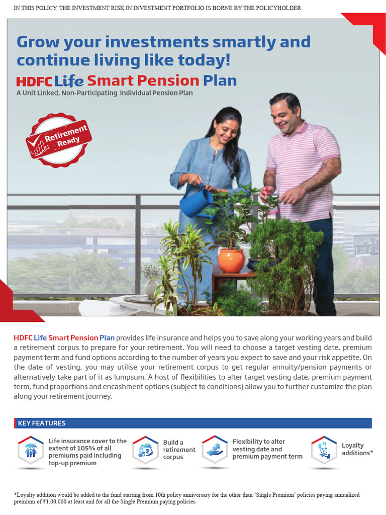 HDFC Life Smart Pension Plan provides life insurance and helps you to save along your working years and build