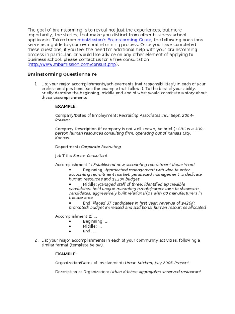 you distinct from other business school applicants. Taken from mbaMissions Brainstorming Guide, the following questions serve as a guide to your own brainstorming process. Once you have completed these questions, if you feel the need for additional help with your brainstorming process in particular, or would like advice on any other element of applying to business school, please contact us for a free consultation (http://www.mbamission.com/consult.php). Brainstorming Questionnaire 1. List your major accomplishments/achievements (not responsibilities!) in each of your