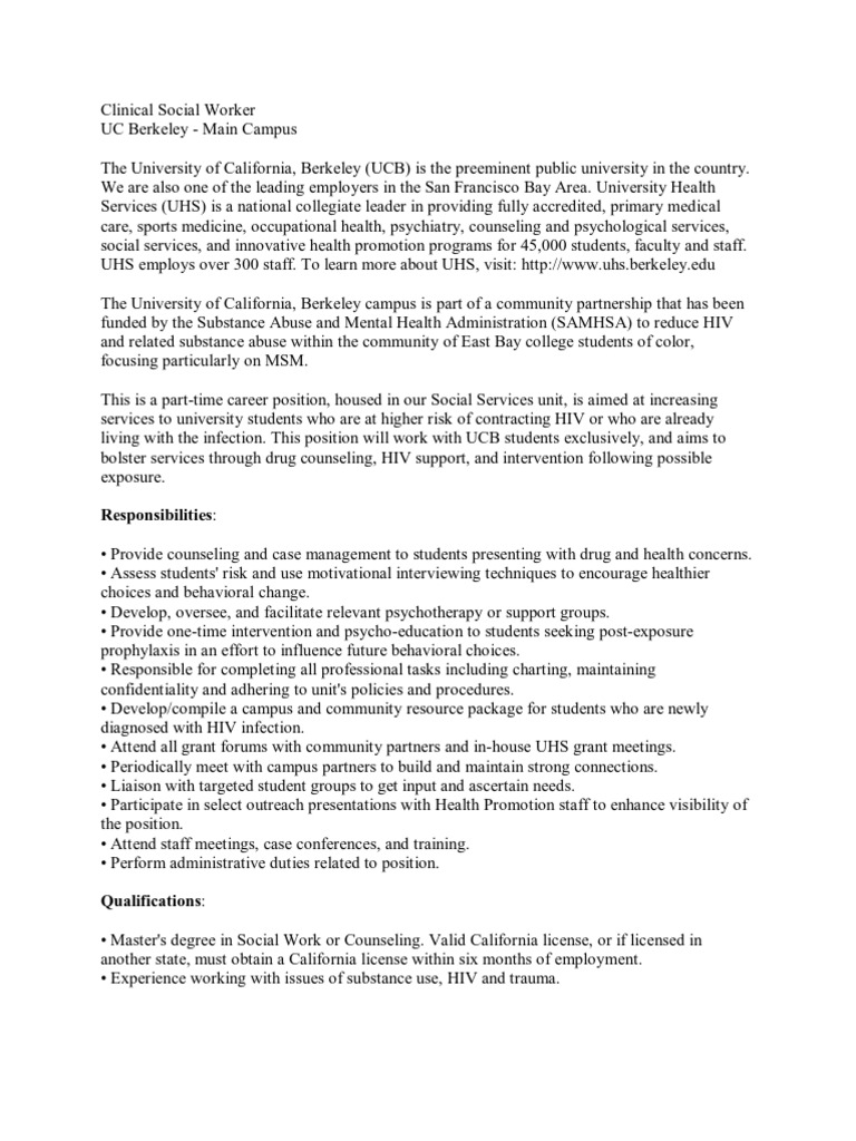 in the country. We are also one of the leading employers in the San Francisco Bay Area. University Health Services (UHS) is a national collegiate leader in providing fully accredited, primary medical care, sports medicine, occupational health, psychiatry, counseling and psychological services, social services, and innovative health promotion programs for 45,000 students, faculty and staff. UHS employs over 300 staff. To learn more about UHS, visit: http://www.uhs.berkeley.edu The University of California, Berkeley campus is part of a community partnership that has been funded by the Substance Abuse and Mental Health Administration (SAMHSA) to reduce HIV and related substance abuse within the community of East Bay college students of color, focusing particularly on MSM. This is a part-time career position, housed in our Social Services unit, is aimed at increasing services to university students who are at higher risk of contracting HIV or who are already living with the infection. This position will work with UCB students exclusively, and aims to bolster services through drug counseling, HIV support, and intervention following possible exposure. Responsibilities: Provide counseling and case management to students presenting with drug and health concerns. Assess students' risk and use motivational interviewing techniques to encourage healthier choices and behavioral change. Develop, oversee, and facilitate relevant psychotherapy or support groups. Provide one-time intervention and psycho-education to students seeking post-exposure prophylaxis in an effort to influence future behavioral choices. Responsible for completing all professional tasks including charting, maintaining confidentiality and adhering to unit's policies and procedures. Develop/compile a campus and community resource package for students who are newly diagnosed with HIV infection. Attend all grant forums with community partners and in-house UHS grant meetings. Periodically meet with campus partners to build and maintain strong connections. Liaison with targeted student groups to get input and ascertain needs. Participate in select outreach presentations with Health Promotion staff to enhance visibility of the position. Attend staff meetings, case conferences, and training. Perform administrative duties related to position. Qualifications: Master's degree in Social Work or Counseling. Valid California license, or if licensed in another state, must obtain a California license within six months of employment. Experience working with issues of substance use, HIV and trauma.