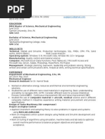 s work, from dismantling and maintaining my own bike to modeling a lift for apartments as a part of a science exhibition; my curiosity was directed at unraveling the functioning of devices. Egged on by my parents and teachers and my innate predilection for science and technology, a mechanical engineering degree was the logical career choice. My undergraduate program was a judicious mix of theory and practice. Fascinating subjects like Operation Research, Engineering management, Automobile engineering, Total Quality Management, Process planning and cost estimation, Marketing management and Advanced IC engines -- compelled me to seek extended knowledge outside the realm of my syllabus. These not only enhanced my learning but also reflected in my excellent academic grades. As part of my academic training, I undertook projects that tested my fundamentals and applied skills. All through my academic program, I had the desire to work on using alternative fuel sources for conserving the environment. This interest of mine received a fillip during my pre-final project where I designed a pressure burner using an alternative fuel source. I prepared a prototype model that simulated an original burner without fabricating the actual burner and accommodated the admission of Jatropha (Alternative Fuel), which is a highly viscous fuel with high ignition point. The project brought in appreciations from my department and a 90% score. My first success inspired and encouraged me to work on more challenging problems. Understanding the current global warming phenomenon, I decided to carry out my final year project work on reducing emission in Compression Ignition (CI) Engines. Under the guidance of my mentor, I designed a Homogeneous Charge Compression Ignition (HCCI) setup and a wet type particulate matter filtering unit, successfully modeling the exact dynamics of the HCCI setup and closely observing and studying the admission of fuel and characteristics of the flame front along with other features. The apparatus helped reduce 80 % NOx and near zero carbon particulate matter was let to the atmosphere. The project was a grand success scoring 100% and was among the top three projects nominated for the best project award. In addition to this, I also underwent in-plant training at Bimetal Bearings Ltd, which is one of the leading manufacturers of automotive bearings, bushings and thrust washers. Here I received exposure to various process involved in manufacturing of bearings and several process automation machines including the process of batch