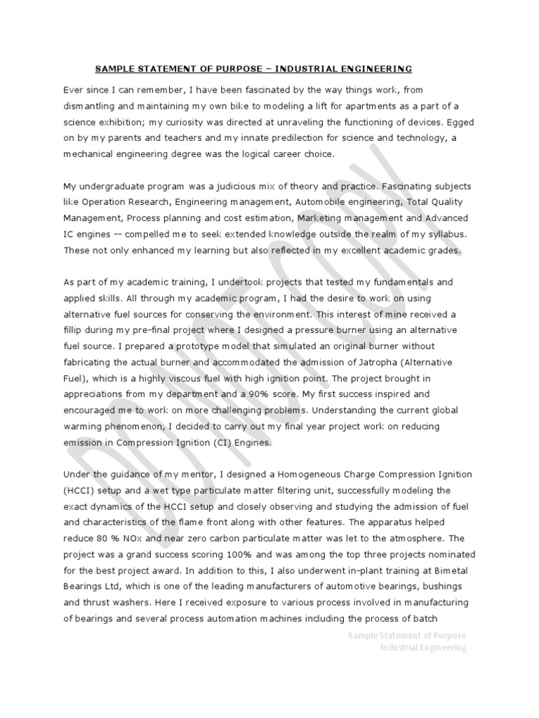 SAMPLE STATEMENT OF PURPOSE INDUSTRIAL ENGINEERING Ever since I can remember, I have been fascinated by the way things