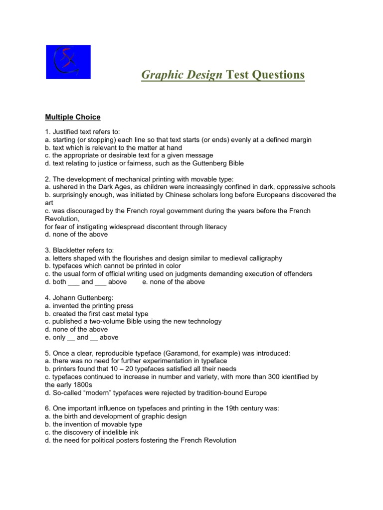 1. Justified text refers to: a. starting (or stopping) each line so that text starts (or ends) evenly at a defined margin b. text which is relevant to the matter at hand c. the appropriate or desirable text for a given message d. text relating to justice or fairness, such as the Guttenberg Bible 2. The development of mechanical printing with movable type: a. ushered in the Dark Ages, as children were increasingly confined in dark, oppressive schools b. surprisingly enough, was initiated by Chinese scholars long before Europeans discovered the art c. was discouraged by the French royal government during the years before the French Revolution, for fear of instigating widespread discontent through literacy d. none of the above 3. Blackletter refers to: a. letters shaped with the flourishes and design similar to medieval calligraphy b. typefaces which cannot be printed in color c. the usual form of official writing used on judgments demanding execution of offenders d. both ___ and ___ above e. none of the above 4. Johann Guttenberg: a. invented the printing press b. created the first cast metal type c. published a two-volume Bible using the new technology d. none of the above e. only __ and __ above 5. Once a clear, reproducible typeface (Garamond, for example) was introduced: a. there was no need for further experimentation in typeface b. printers found that 10 20 typefaces satisfied all their needs c. typefaces continued to increase in number and variety, with more than 300 identified by the early 1800s d. So-called modern typefaces were rejected by tradition-bound Europe 6. One important influence on typefaces and printing in the 19th century was: a. the birth and development of graphic design b. the invention of movable type c. the discovery of indelible ink d. the need for political posters fostering the French Revolution