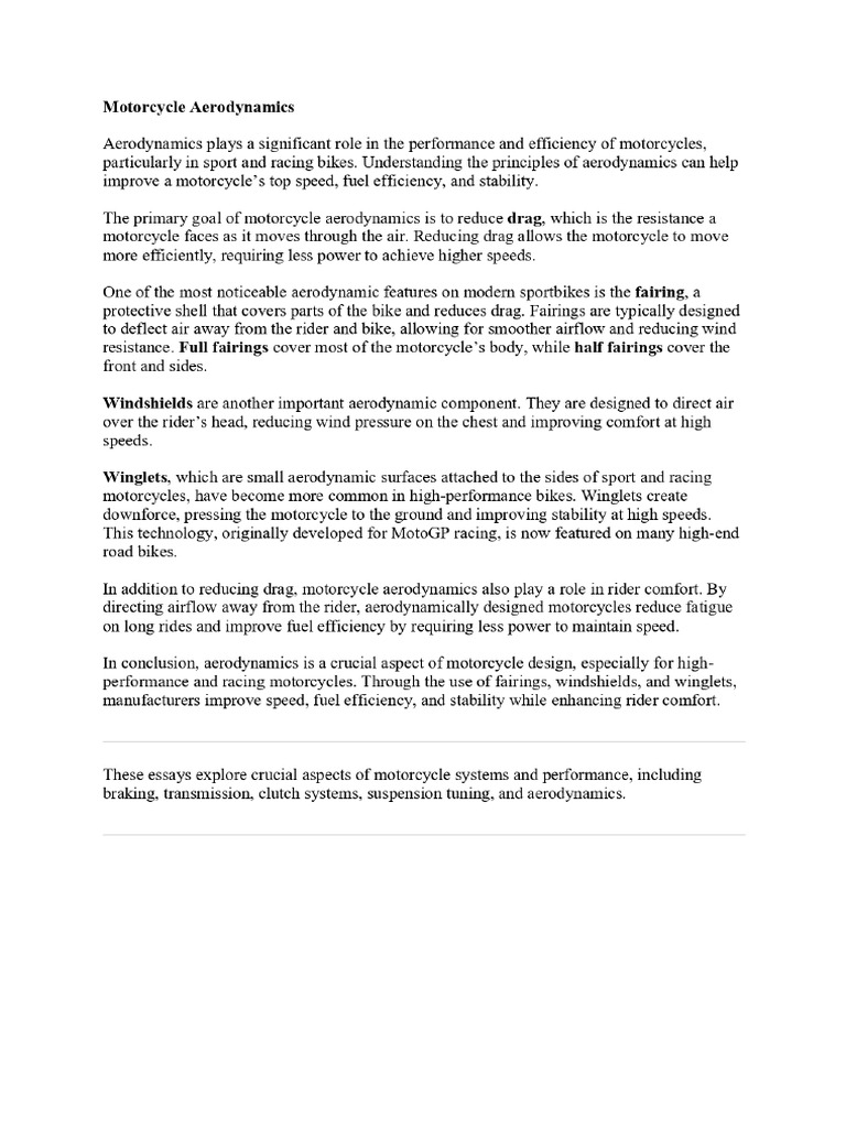 These essays explore crucial aspects of motorcycle systems and performance, including