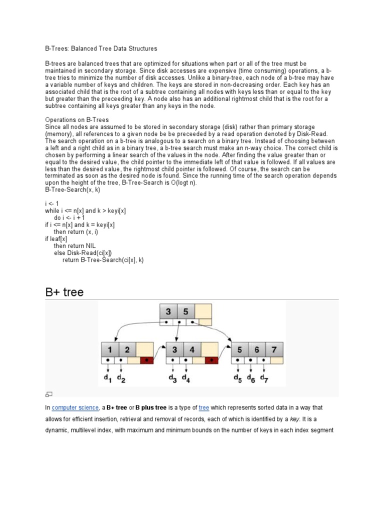 part or all of the tree must be maintained in secondary storage. Since disk accesses are expensive (time consuming) operations, a btree tries to minimize the number of disk accesses. Unlike a binary-tree, each node of a b-tree may have a variable number of keys and children. The keys are stored in non-decreasing order. Each key has an associated child that is the root of a subtree containing all nodes with keys less than or equal to the key but greater than the preceeding key. A node also has an additional rightmost child that is the root for a subtree containing all keys greater than any keys in the node. Operations on B-Trees Since all nodes are assumed to be stored in secondary storage (disk) rather than primary storage (memory), all references to a given node be be preceeded by a read operation denoted by Disk-Read. The search operation on a b-tree is analogous to a search on a binary tree. Instead of choosing between a left and a right child as in a binary tree, a b-tree search must make an n-way choice. The correct child is chosen by performing a linear search of the values in the node. After finding the value greater than or equal to the desired value, the child pointer to the immediate left of that value is followed. If all values are less than the desired value, the rightmost child pointer is followed. Of course, the search can be terminated as soon as the desired node is found. Since the running time of the search operation depends upon the height of the tree, B-Tree-Search is O(logt n). B-Tree-Search(x, k) i <- 1 while i <= n[x] and k > keyi[x] do i <- i + 1 if i <= n[x] and k = keyi[x] then return (x, i) if leaf[x] then return NIL else Disk-Read(ci[x]) return B-Tree-Search(ci[x], k)