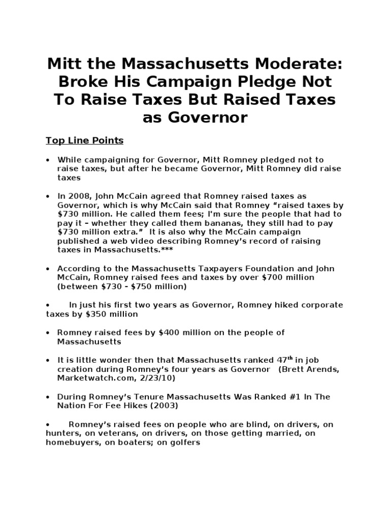Romney pledged not to raise taxes while campaigning for governor. But after he became governor, Romney did raise taxes. In just his first two years as governor, Romney hiked corporate taxes …