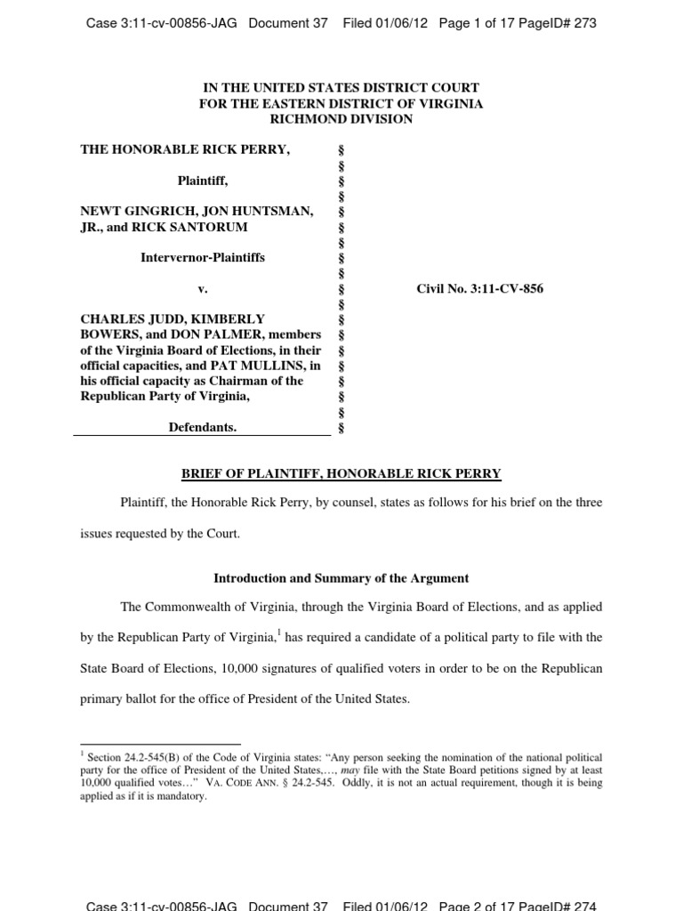 IN THE UNITED STATES DISTRICT COURT FOR THE EASTERN DISTRICT OF VIRGINIA RICHMOND DIVISION THE HONORABLE RICK PERRY, § § Plaintiff, § § NEWT GINGRICH, JON HUNTSMAN, JR., and RICK SANTORUM §§ § Intervernor-Plaintiffs § § v. § Civil No. 3:11-CV-856 § CHARLES JUDD, KIMBERLY BOWERS, and DON PALMER, members of the Virginia Board of Elections, in their official capacities, and PAT MULLINS, in his official capacity as Chairman of the Republican Party of Virginia, §§§§§§ § Defendants. § BRIEF OF PLAINTIFF, HONORABLE RICK PERRY