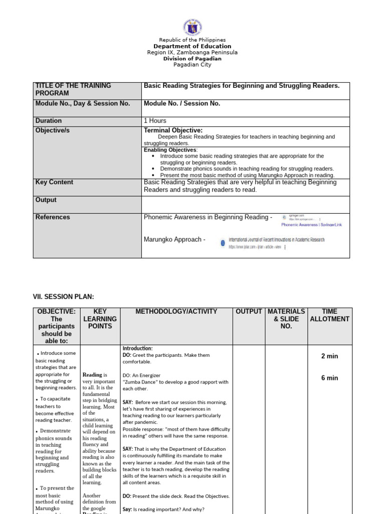 TITLE OF THE TRAINING Basic Reading Strategies for Beginning and Struggling Readers.
