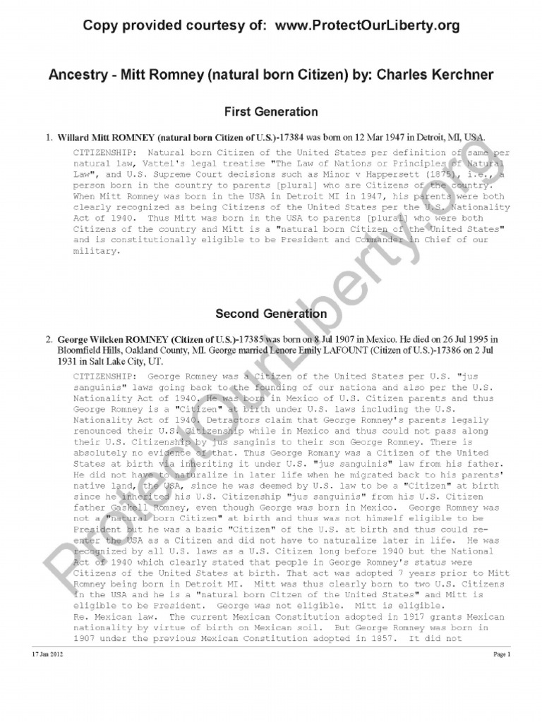 17 Jan 2012Page 2Ancestry - Mitt Romney (natural born Citizen) by: Charles Kerchner