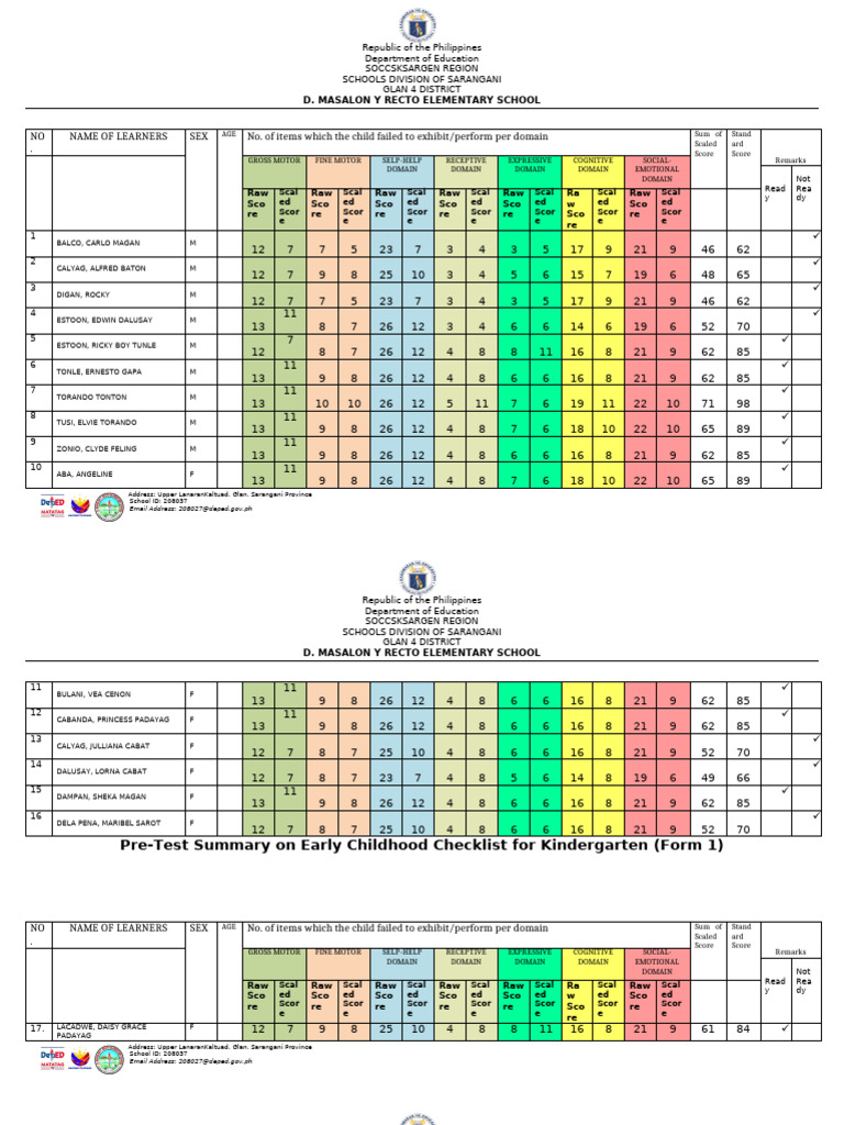 Pre-Test Summary on Early Childhood Checklist for Kindergarten (Form 1)