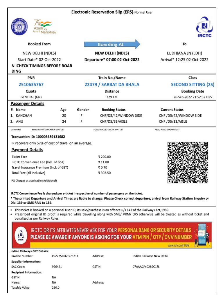 Invoice Number 2225106357671 Adéress: Indian Raltways New Delhi