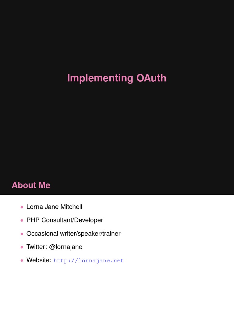 Lorna Jane Mitchell PHP Consultant/Developer Occasional writer/speaker/trainer Twitter: @lornajane Website: http://lornajane.net I am excited about OAuth :)
