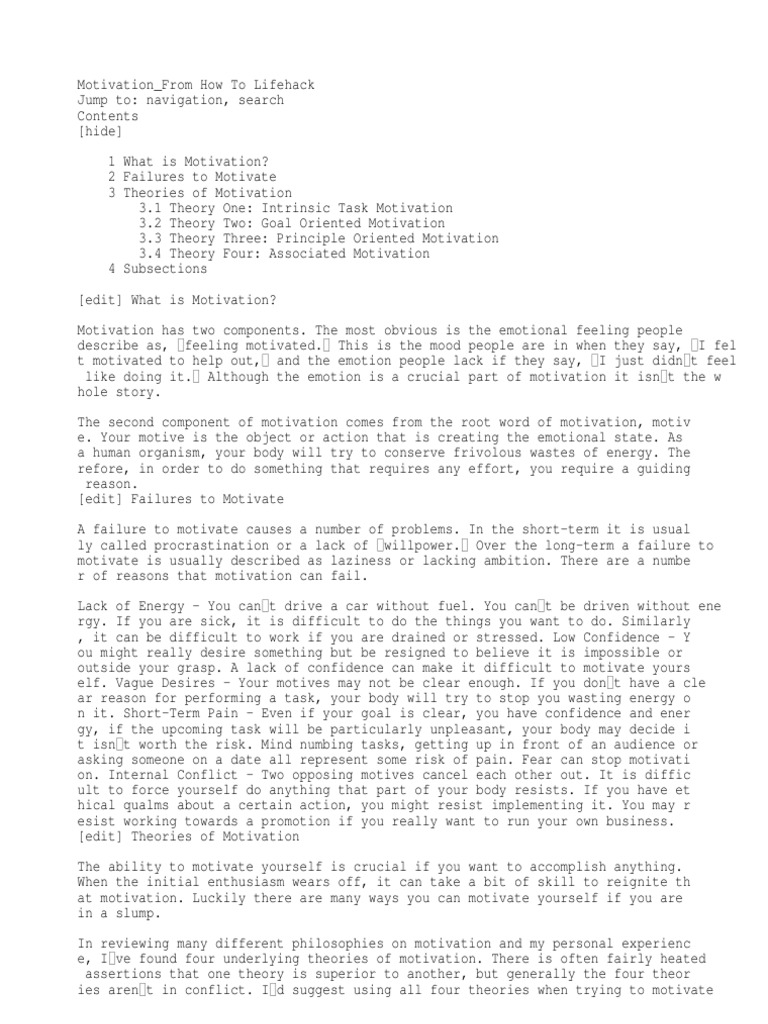 Motivation_From How To Lifehack Jump to: navigation, search Contents [hide] 1 What is Motivation?
