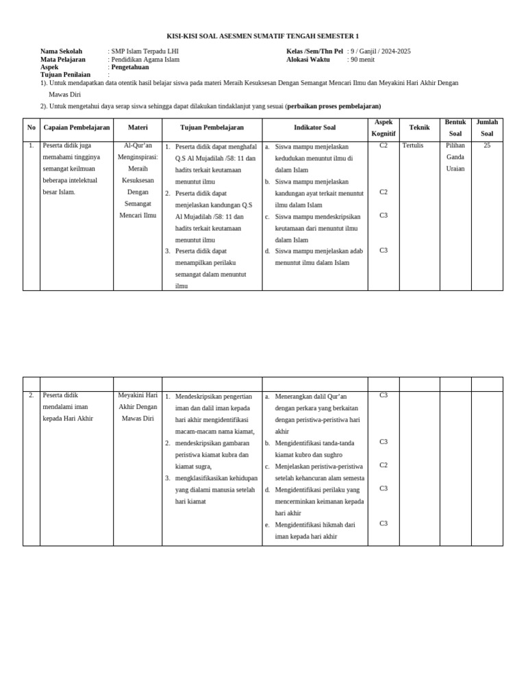 Nama Sekolah : SMP Islam Terpadu LHI Kelas /Sem/Thn Pel : 9 / Ganjil / 2024-2025