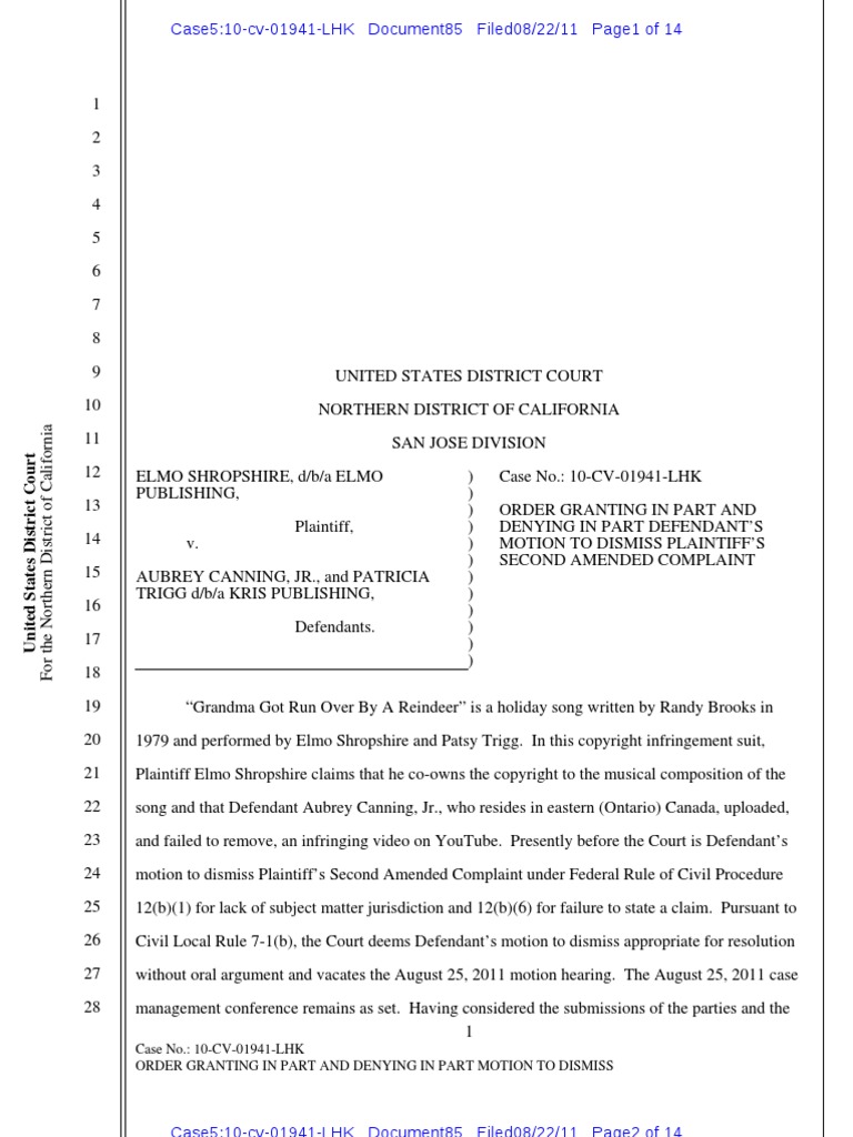 UNITED STATES DISTRICT COURT NORTHERN DISTRICT OF CALIFORNIA SAN JOSE DIVISION ELMO SHROPSHIRE, d/b/a ELMO PUBLISHING, Plaintiff, v. AUBREY CANNING, JR., and PATRICIA TRIGG d/b/a KRIS PUBLISHING, Defendants. )) ) ) ) ) ) ) ) ) ) )CaseNo.:10-CV-01941-LHK ORDER GRANTING IN PART AND DENYING IN PART DEFENDANT’S MOTION TO DISMISS PLAINTIFF’S SECOND AMENDED COMPLAINT “Grandma Got Run Over By A Reindeer” is a holiday song written by Randy Brooks in 1979 and performed by Elmo Shropshire and Patsy Trigg. In this copyright infringement suit, Plaintiff Elmo Shropshire claims that he co-owns the copyright to the musical composition of the song and that Defendant Aubrey Canning, Jr., who resides in eastern (Ontario) Canada, uploaded, and failed to remove, an infringing video on YouTube. Presently before the Court is Defendant’s motion to dismiss Plaintiff’s Second Amended Complaint under Federal Rule of Civil Procedure 12(b)(1) for lack of subject matter jurisdiction and 12(b)(6) for failure to state a claim. Pursuant to Civil Local Rule 7-1(b), the Court deems Defendant’s motion to dismiss appropriate for resolution without oral argument and vacates the August 25, 2011 motion hearing. The August 25, 2011 case management conference remains as set. Having considered the submissions of the parties and the