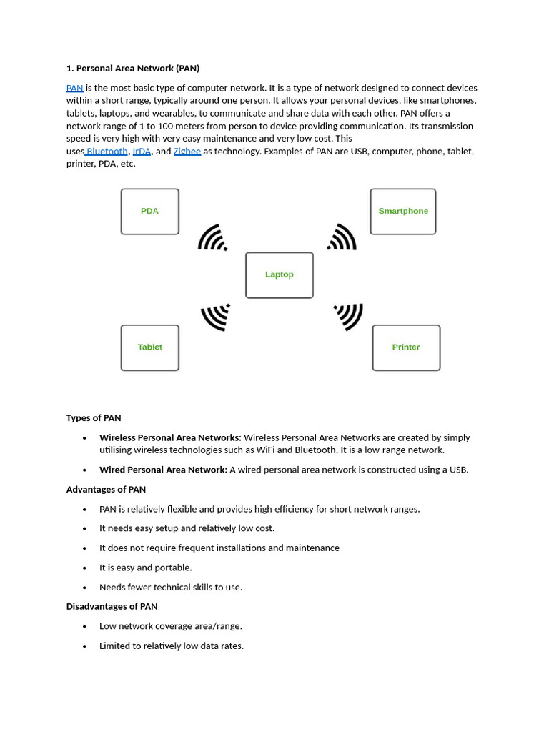 uses Bluetooth, IrDA, and Zigbee as technology. Examples of PAN are USB, computer, phone, tablet,
