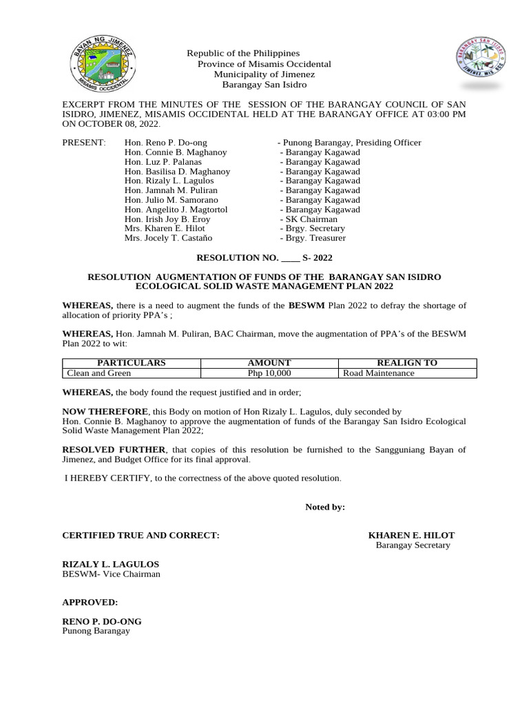 RESOLUTION AUGMENTATION OF FUNDS OF THE BARANGAY SAN ISIDRO
