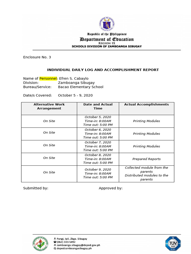 INDIVIDUAL DAILY LOG AND ACCOMPLISHMENT REPORT
