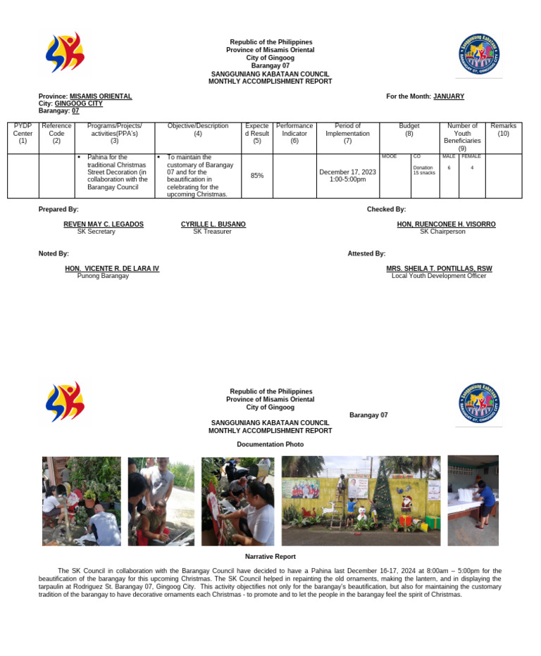 beautification of the barangay for this upcoming Christmas. The SK Council helped in repainting the old ornaments, making the lantern, and in displaying the