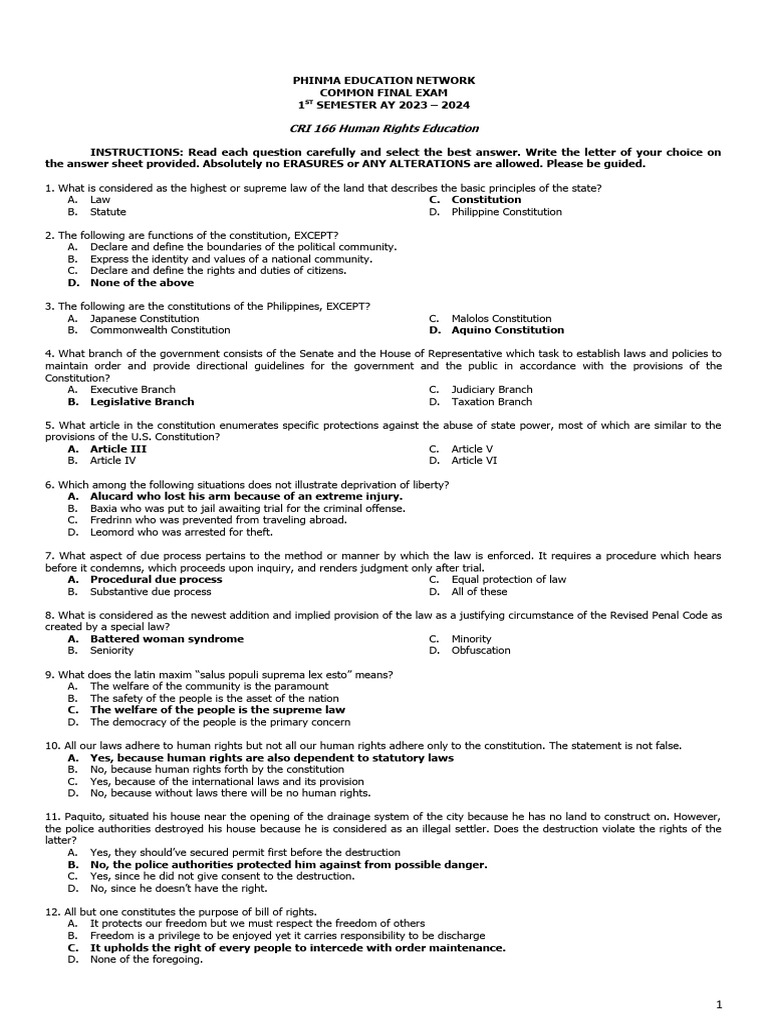 the answer sheet provided. Absolutely no ERASURES or ANY ALTERATIONS are allowed. Please be guided.