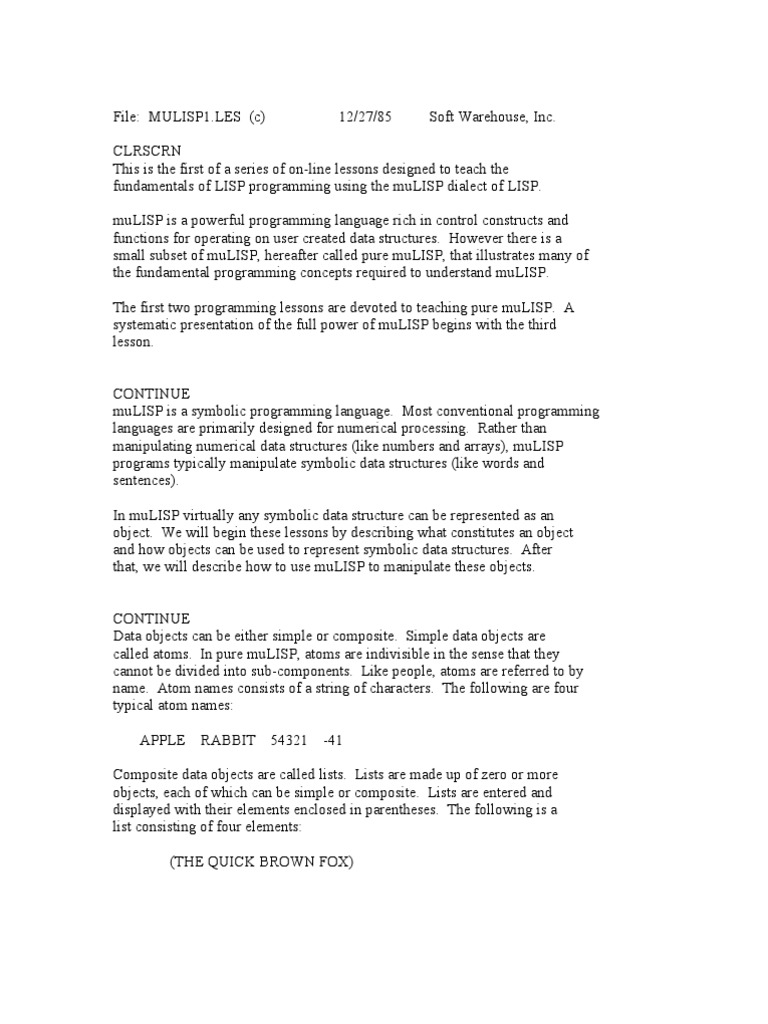 CLRSCRN This is the first of a series of on-line lessons designed to teach the fundamentals of LISP programming using the muLISP dialect of LISP. muLISP is a powerful programming language rich in control constructs and functions for operating on user created data structures. However there is a small subset of muLISP, hereafter called pure muLISP, that illustrates many of the fundamental programming concepts required to understand muLISP. The first two programming lessons are devoted to teaching pure muLISP. A systematic presentation of the full power of muLISP begins with the third lesson. CONTINUE muLISP is a symbolic programming language. Most conventional programming languages are primarily designed for numerical processing. Rather than manipulating numerical data structures (like numbers and arrays), muLISP programs typically manipulate symbolic data structures (like words and sentences). In muLISP virtually any symbolic data structure can be represented as an object. We will begin these lessons by describing what constitutes an object and how objects can be used to represent symbolic data structures. After that, we will describe how to use muLISP to manipulate these objects. CONTINUE Data objects can be either simple or composite. Simple data objects are called atoms. In pure muLISP, atoms are indivisible in the sense that they cannot be divided into sub-components. Like people, atoms are referred to by name. Atom names consists of a string of characters. The following are four typical atom names: APPLE RABBIT 54321 -41