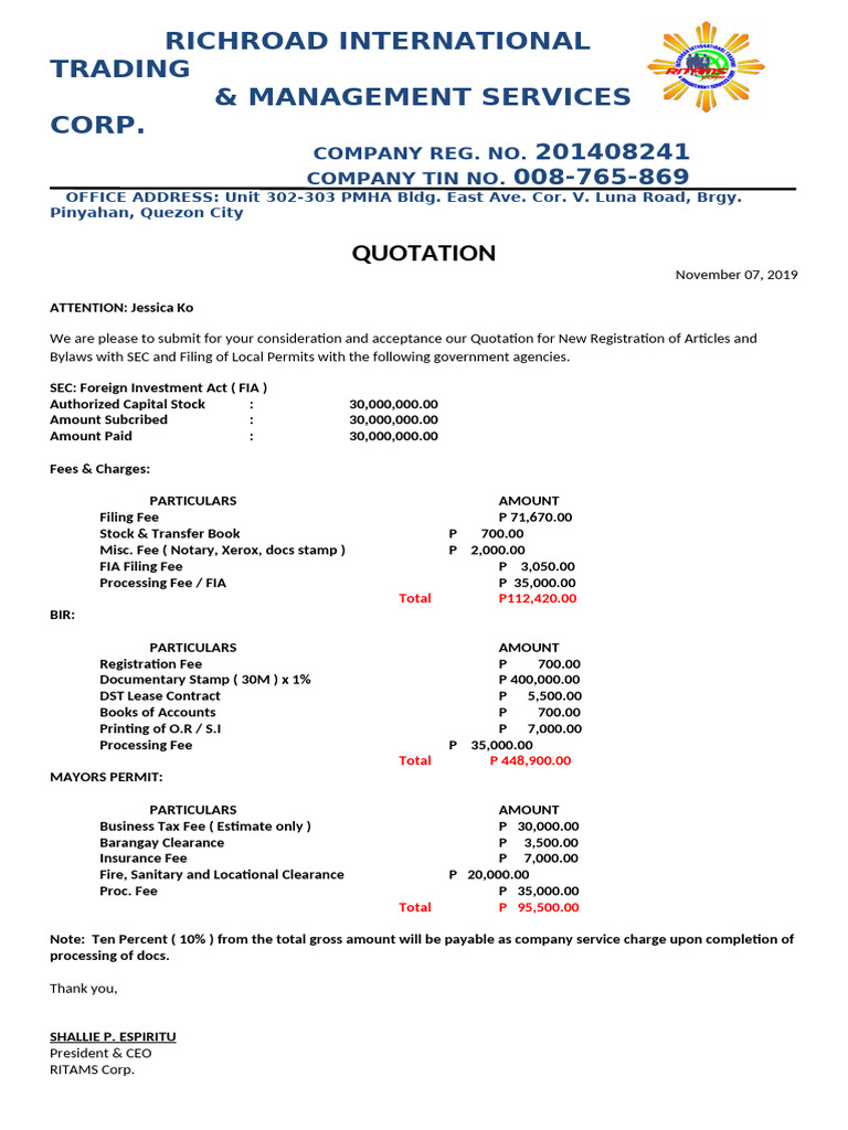 We are please to submit for your consideration and acceptance our Quotation for New Registration of Articles and