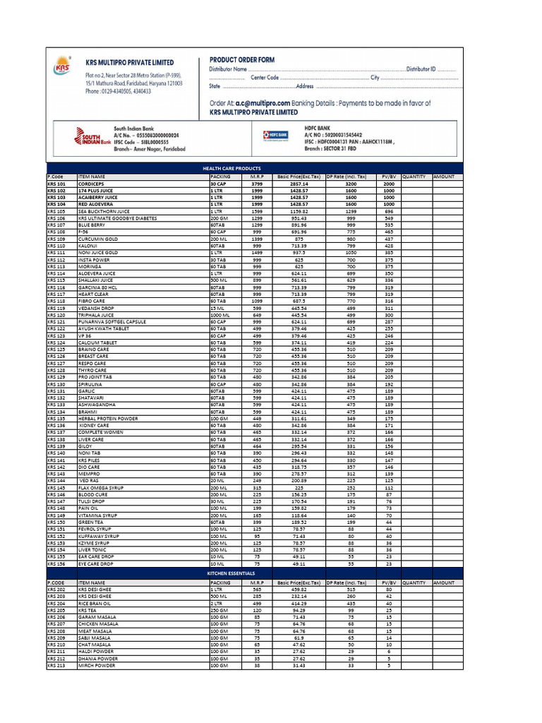 P.Code ITEM NAME PACKING M.R.P Basic Price(Exc.Tax) DP Rate (Incl. Tax) PV/BV QUANTITY AMOUNT