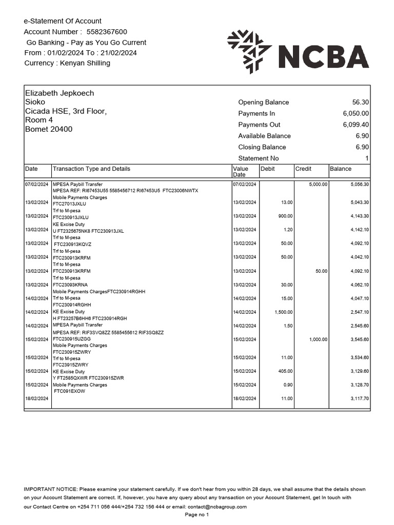 15/02/2024 Trf to M-pesa 15/02/2024 11.00 3,534.60
