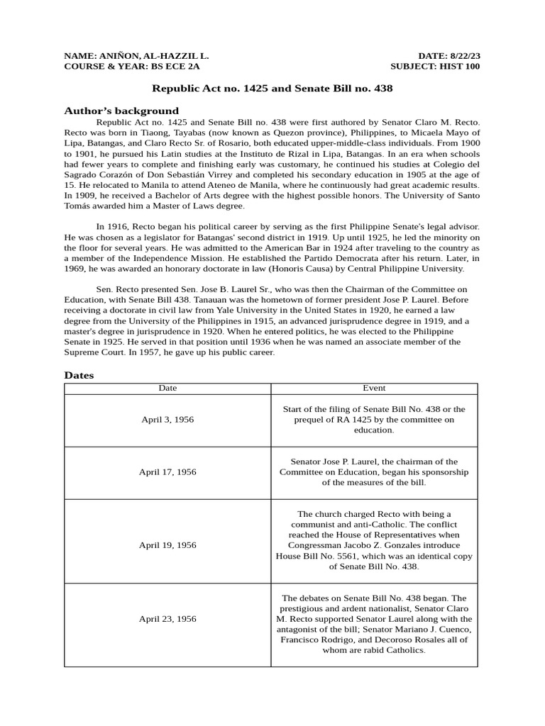 Republic Act no. 1425 and Senate Bill no. 438 were first authored by Senator Claro M. Recto.