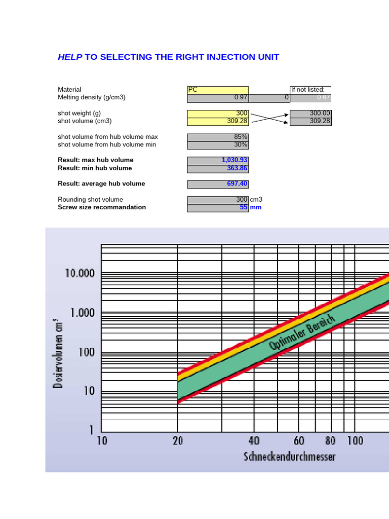 Schmelzdichte Spritzvolumen von hubvolumen max