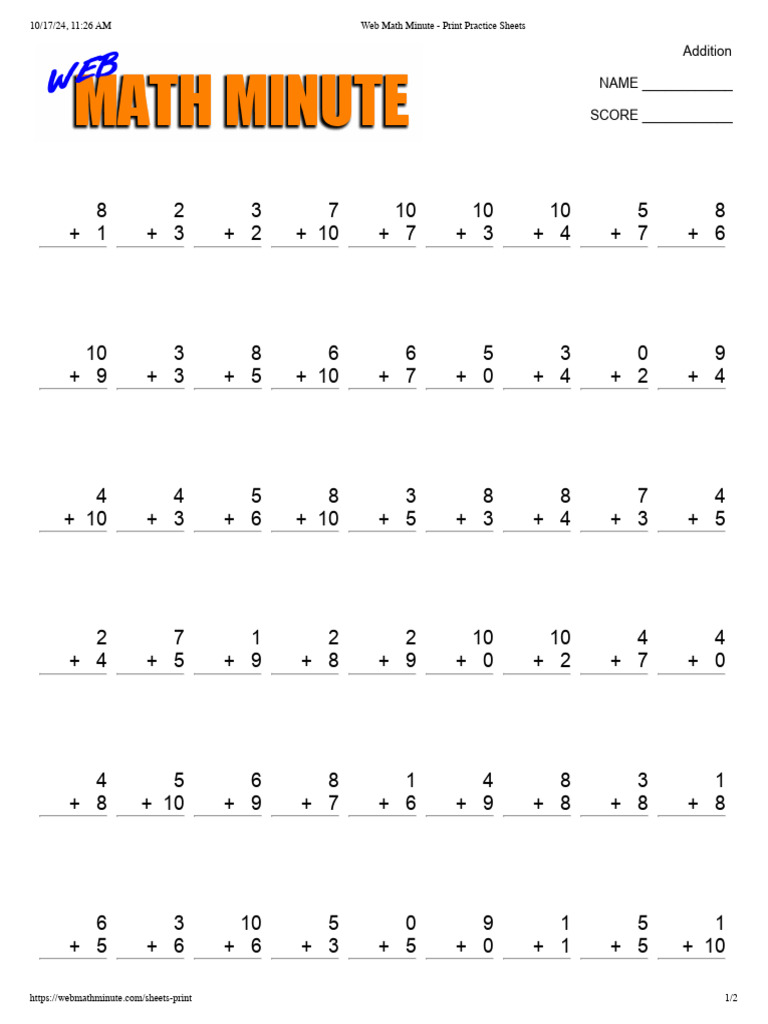 10/17/24, 11:26 AM Web Math Minute - Print Practice Sheets